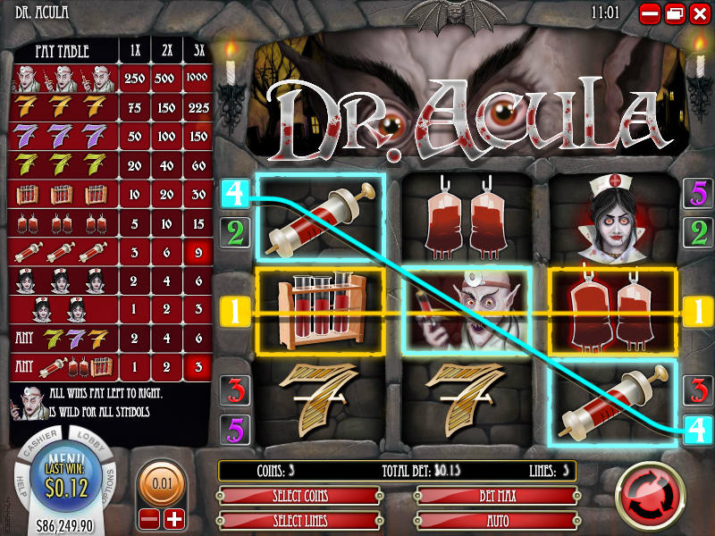 Moenie geflous word deur die aantreklike grafika nie; Dr. Acula is 'n ware klassieke slotmasjien wanneer dit kom by spel en kenmerke. Die enigste opsie is 'n eenvoudige wilde; niks anders is beskikbaar nie.