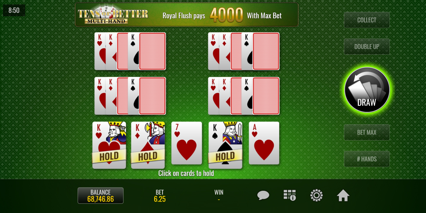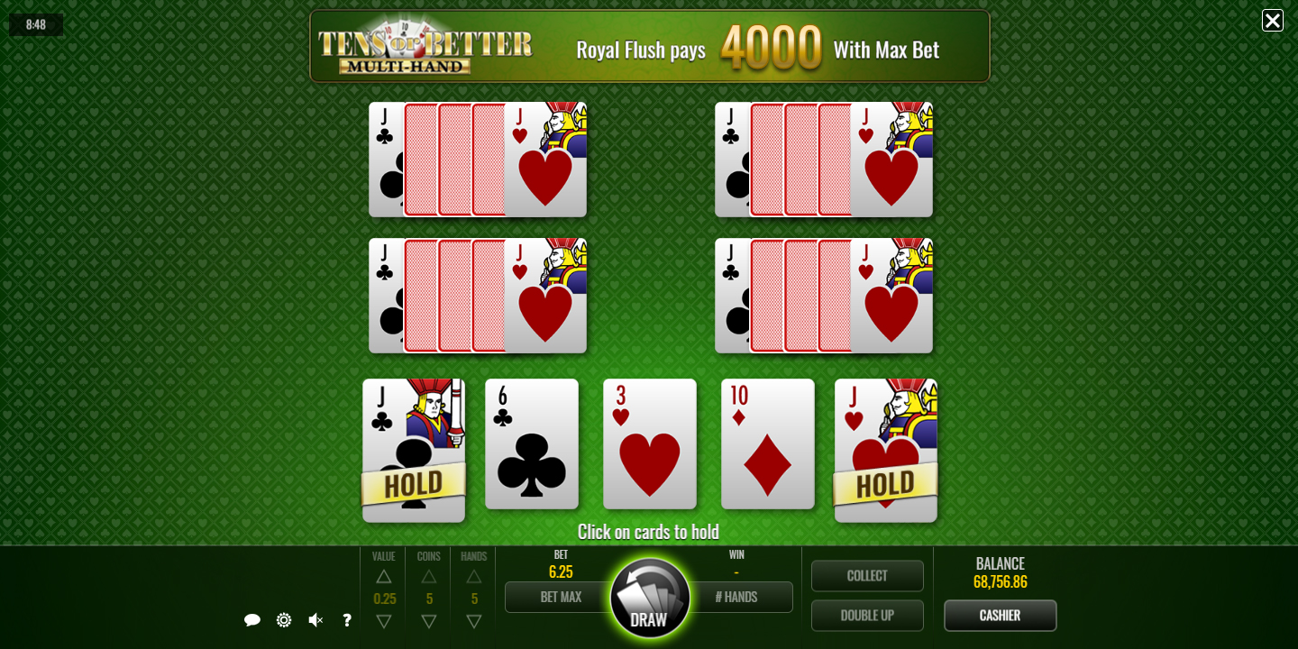 Tien of beter Multi-Hand video poker strategieë is belangrik om te leer wanneer jy teen die rekenaar kompeteer eerder as ander spelers. Dit is 'n eenhandspeletjie waarin die speler se doelwit is om ten minste twee tiene onder die kaarte te hê wat uitgedeel word. Die Royal Flush is die hoogste betalende kombinasie.