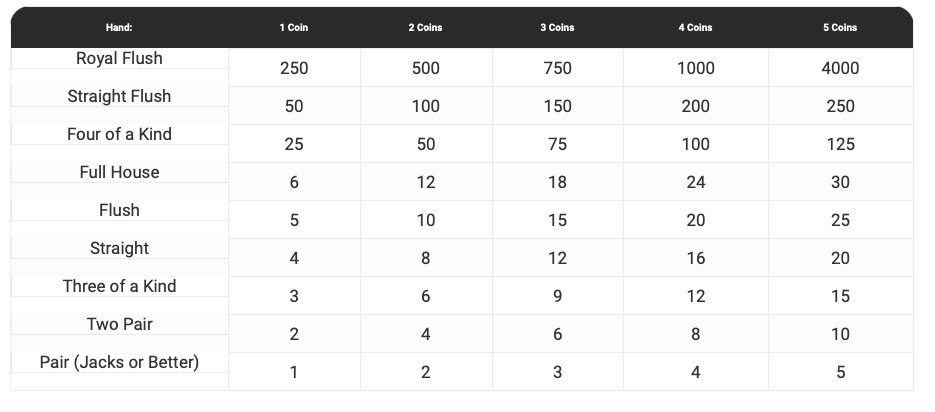 • Kyk na die tabel hierbo om te sien hoe ruim die uitbetaling is vir 'n Royal Flush en 'n weddenskap van 5 munte. Om dit anders te stel, die verstandigste ding wat jy kan doen, is om altyd die hoogste weddenskap te plaas.