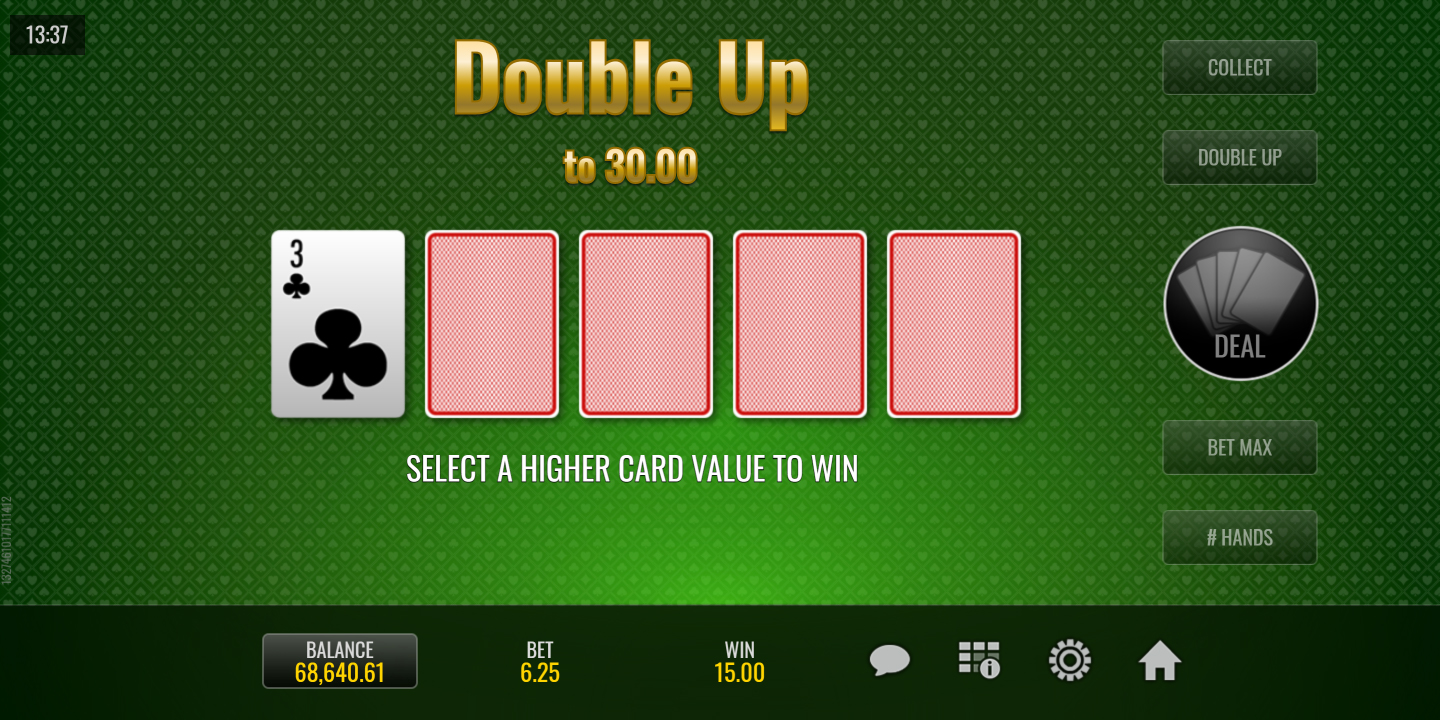 As jy al ooit poker met 'n hoë inset gespeel het, is jy waarskynlik vertroud met die Gamble-funksie, wat jou toelaat om jou winste te verdubbel deur die Dubbel-knoppie te druk. As jy nie jou winste wil waag nie, druk eenvoudig die Versamel-knoppie. As jy kies om jou weddenskap te verdubbel, sal 5 kaarte vertoon word, maar net die eerste kaart van links na regs sal gesig na bo wees.