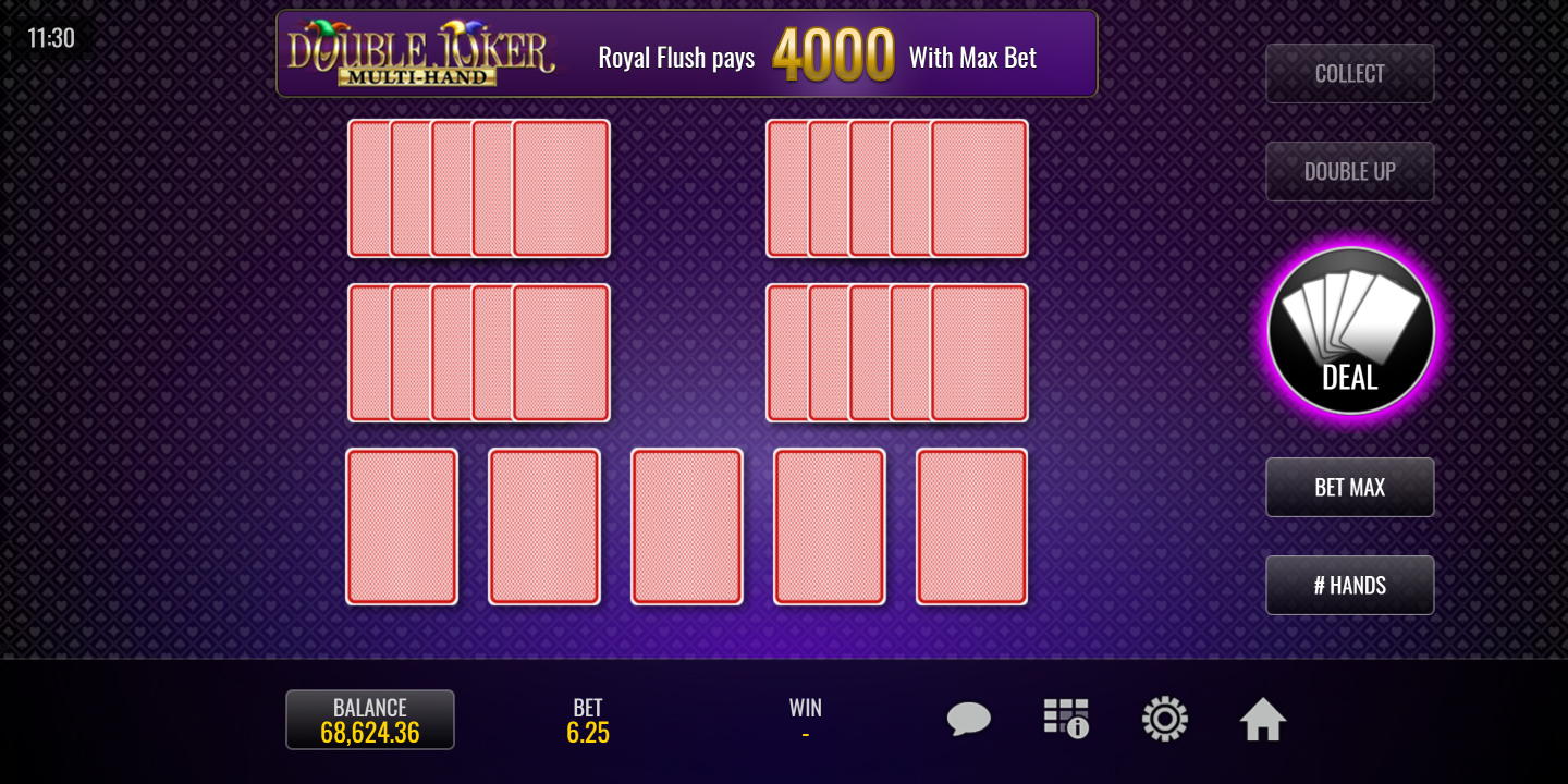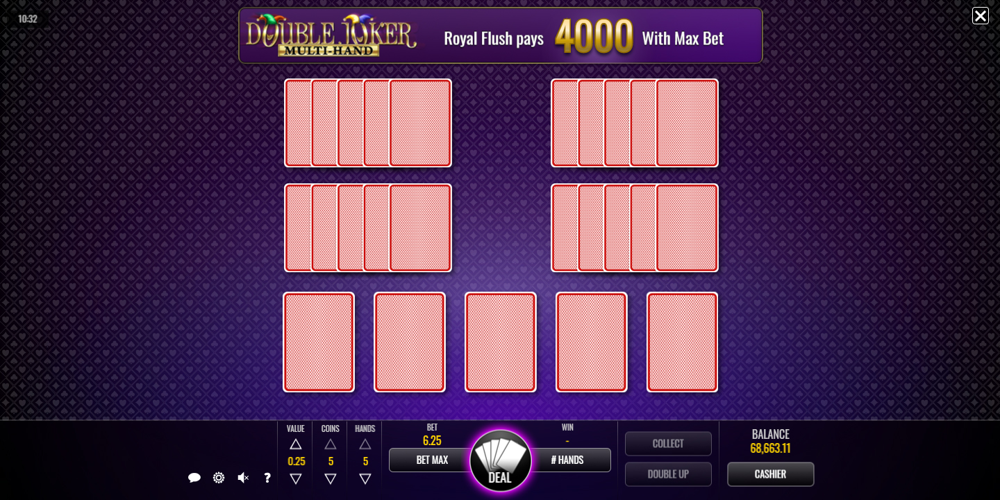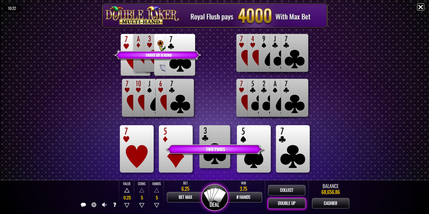 Double Joker Multi-Hand video poker game uses a 54-card deck rather than a 52-card deck. The deck includes two Joker cards that can be used to replace any other card. This means that developing large hands is simple. However, due to the jokers, the payouts begin with two pairs. They progress all the way up to the royal flush, which can be worth up to 4.000 coins.