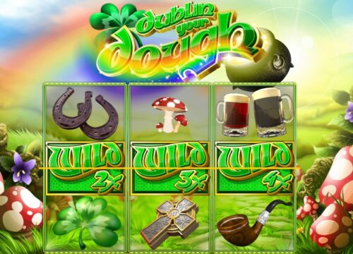 Dublin Your Dough is an Irish-themed video slot game, therefore the screen is decorated with symbols from Irish culture and legend, such as the enigmatic Leprechauns, Rainbows, Gold Pots, Shamrocks, Mushrooms, Toasting Beer Mugs, Toadstools, Harps, Horseshoes, Celtic Crosses, Gold Coins, and symbols, including the Wild symbol.