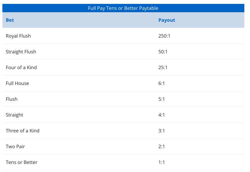 Den förväntade avkastningen till spelaren är 99.14%. En annan viktig faktor att tänka på när du väljer ett videopokerspel att spela är vinsttabellen. I detta avseende sägs Tens or Better ofta ha lägre lönekvoter än Jacks or Better. Detta beror på det faktum att Tens or Better tillåter spelare att bilda en vinnande kombination med ett svagare kortpar, vilket ökar deras chanser att vinna. Tens or Better betalar ut enligt följande vinsttabell som "Full Pay":
