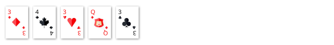 Detta är en hand som består av tre identiska kort och två slumpmässiga kort. För den här handen är färgerna oviktiga. Till exempel är 3-4-3-Q-3 en Three of a Kind-hand.