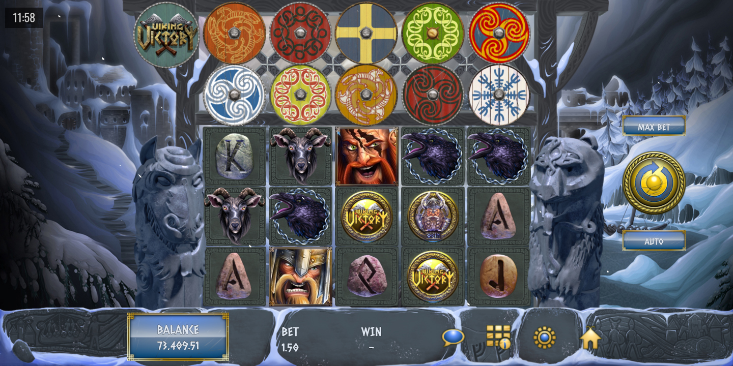 The background of this slot machine is a Scandinavian fjord, and the gaming window is a Viking longship. The Norse warriors return from their last pillaging excursion in bonus rounds to give you a selection of valuables. The epic feeling is enhanced by billowing smoke and war cries on the side of the reels. The Vikings’ Victory slot machine has a 5×3-reel layout and 243 fixed pay lines. Only two to five matching symbols in a line from left to the right result in a win.