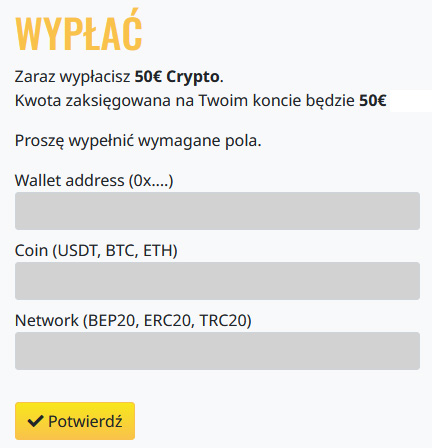 Przy wypłatach realizowane za pomocą cyfrowego portfela, pieniądze przelewane są na Twoje konto, zaledwie kilka minut po potwierdzeniu żądania wypłaty.