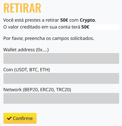 Os levantamentos serão recebidos por transferência bancária e o valor mínimo é de 50 Euros/USD.